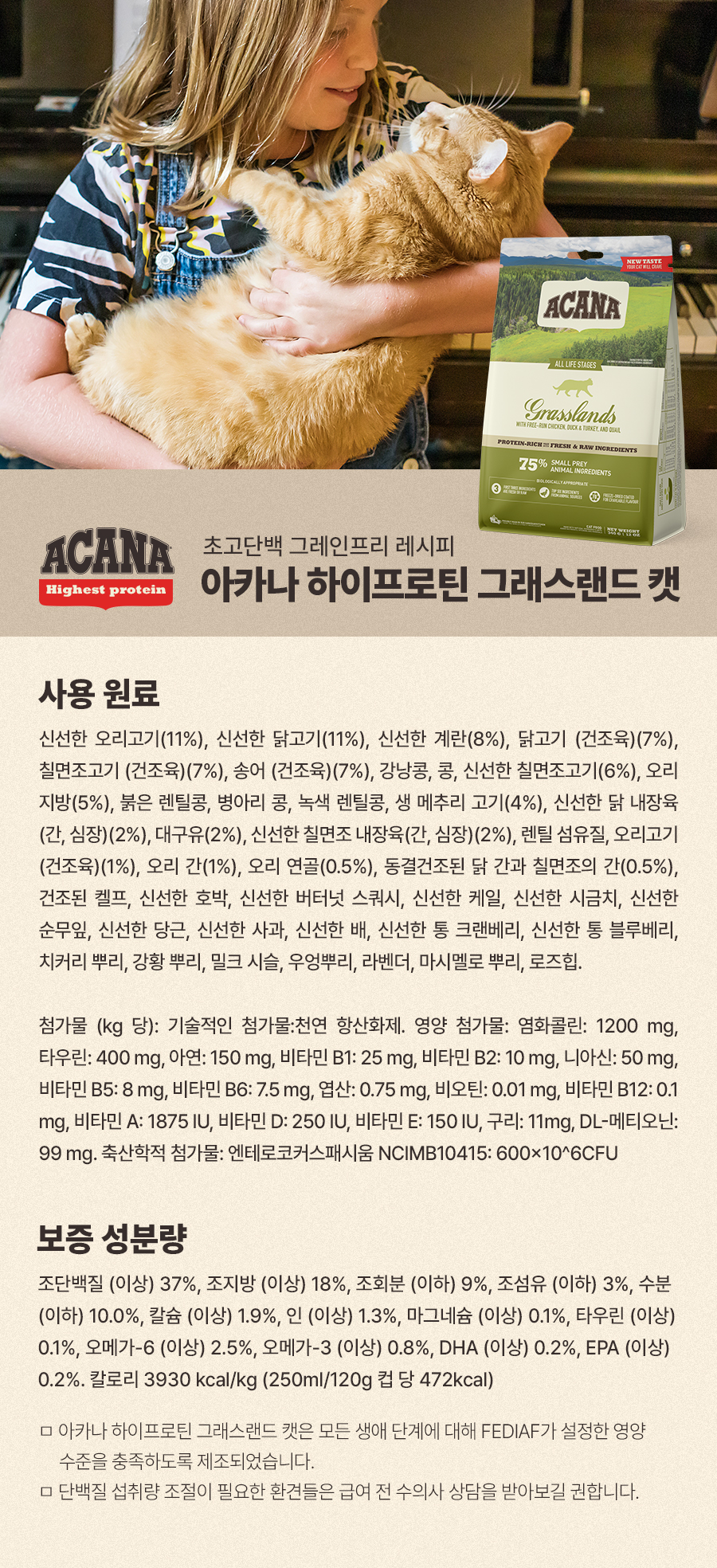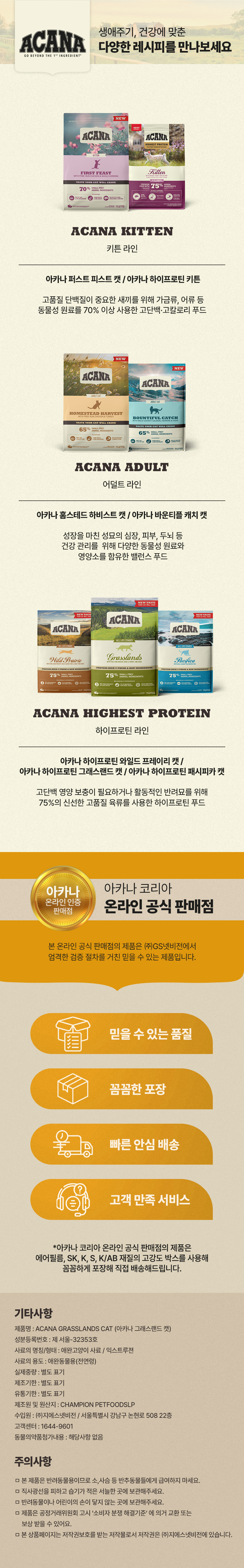 광활한 초원과 차가운 북쪽 호수에서 영감을 얻은 ACANA GRASSLANDS는 자연에서 놓아기른 오리, 닭, 칠면조, 자연란과 야생에서 잡은 물고기가 통고기 비율로 들어있습니다.