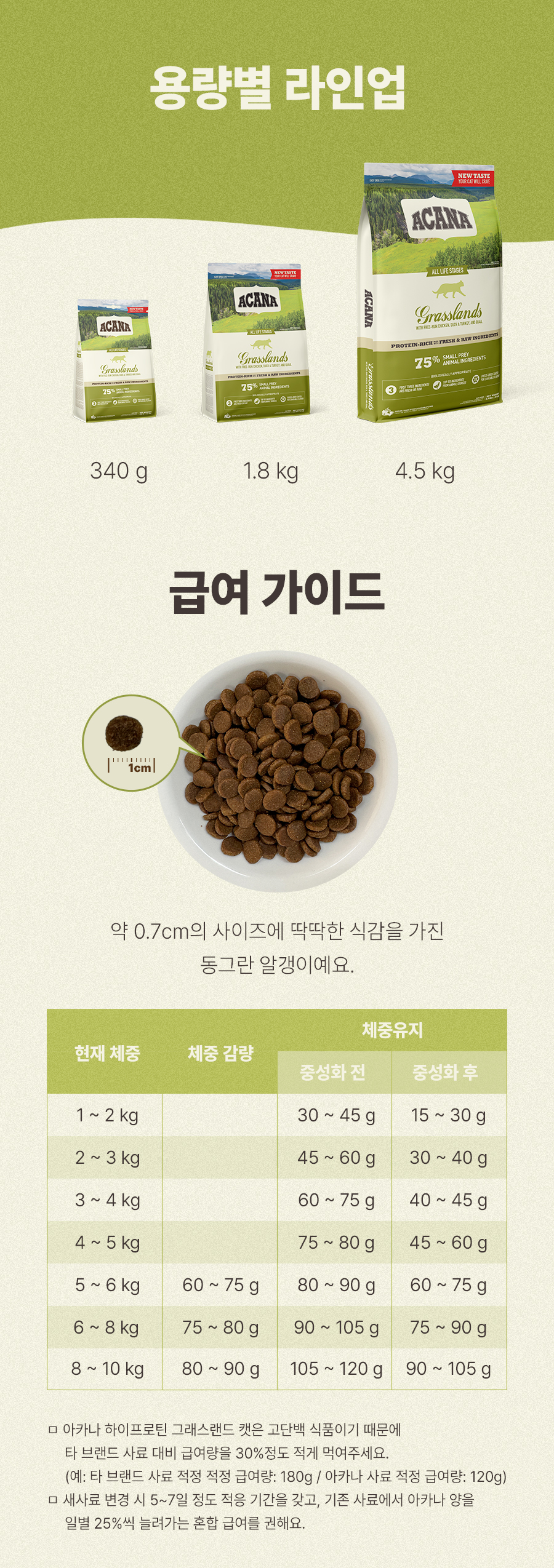 광활한 초원과 차가운 북쪽 호수에서 영감을 얻은 ACANA GRASSLANDS는 자연에서 놓아기른 오리, 닭, 칠면조, 자연란과 야생에서 잡은 물고기가 통고기 비율로 들어있습니다.